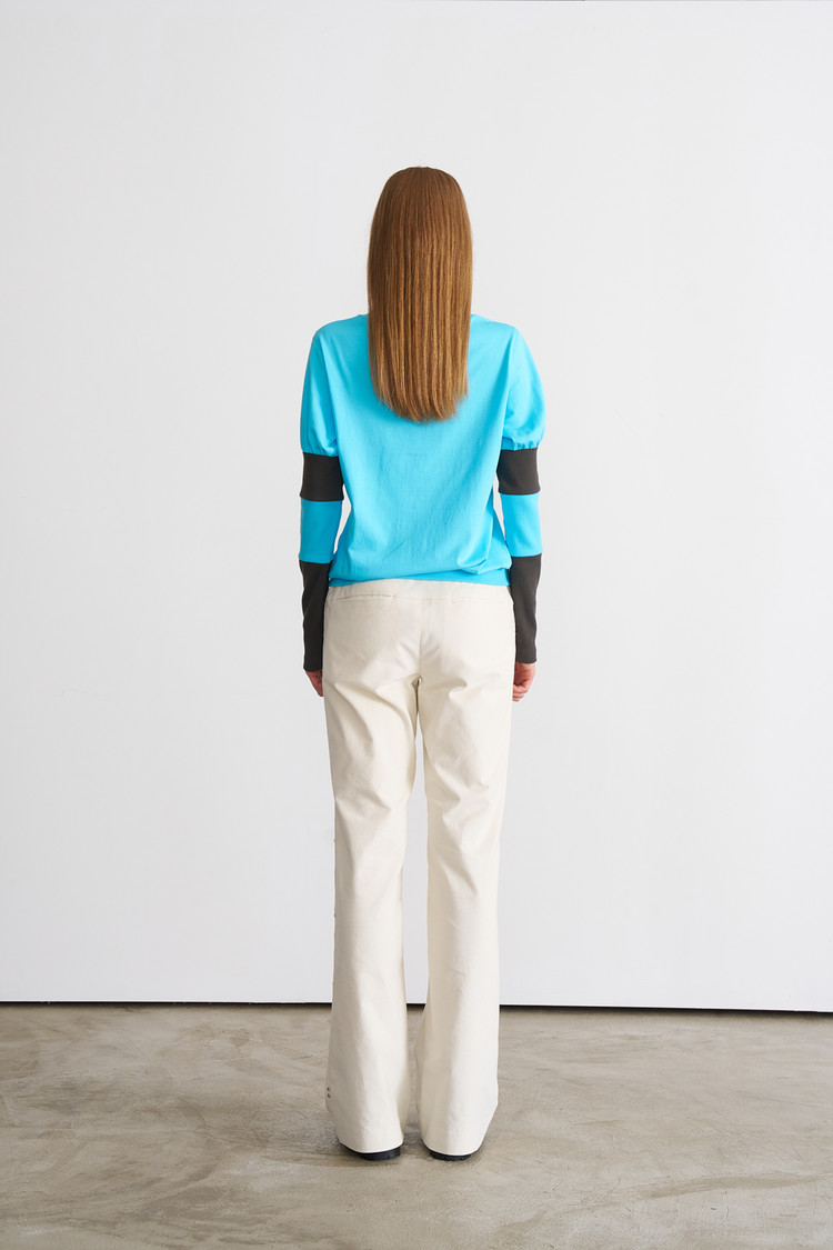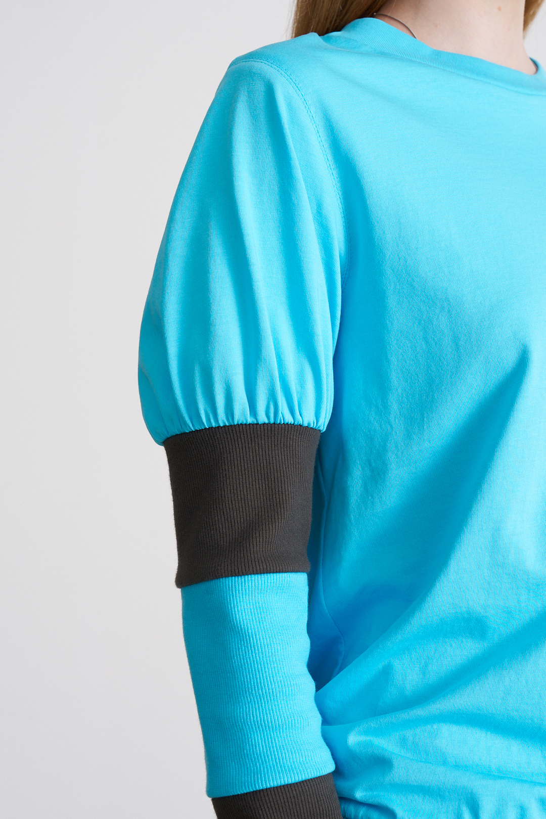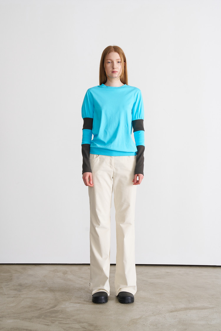 부담스럽지 않은 퍼프 소매와 청량한 컬러 블로킹 소매가 돋보이는 탑입니다. 퍼프 소매 아래로 이어지는 소매는 립 원단을 사용하여 슬림한 핏으로, 편안하고 독특한 실루엣을 연출했습니다.