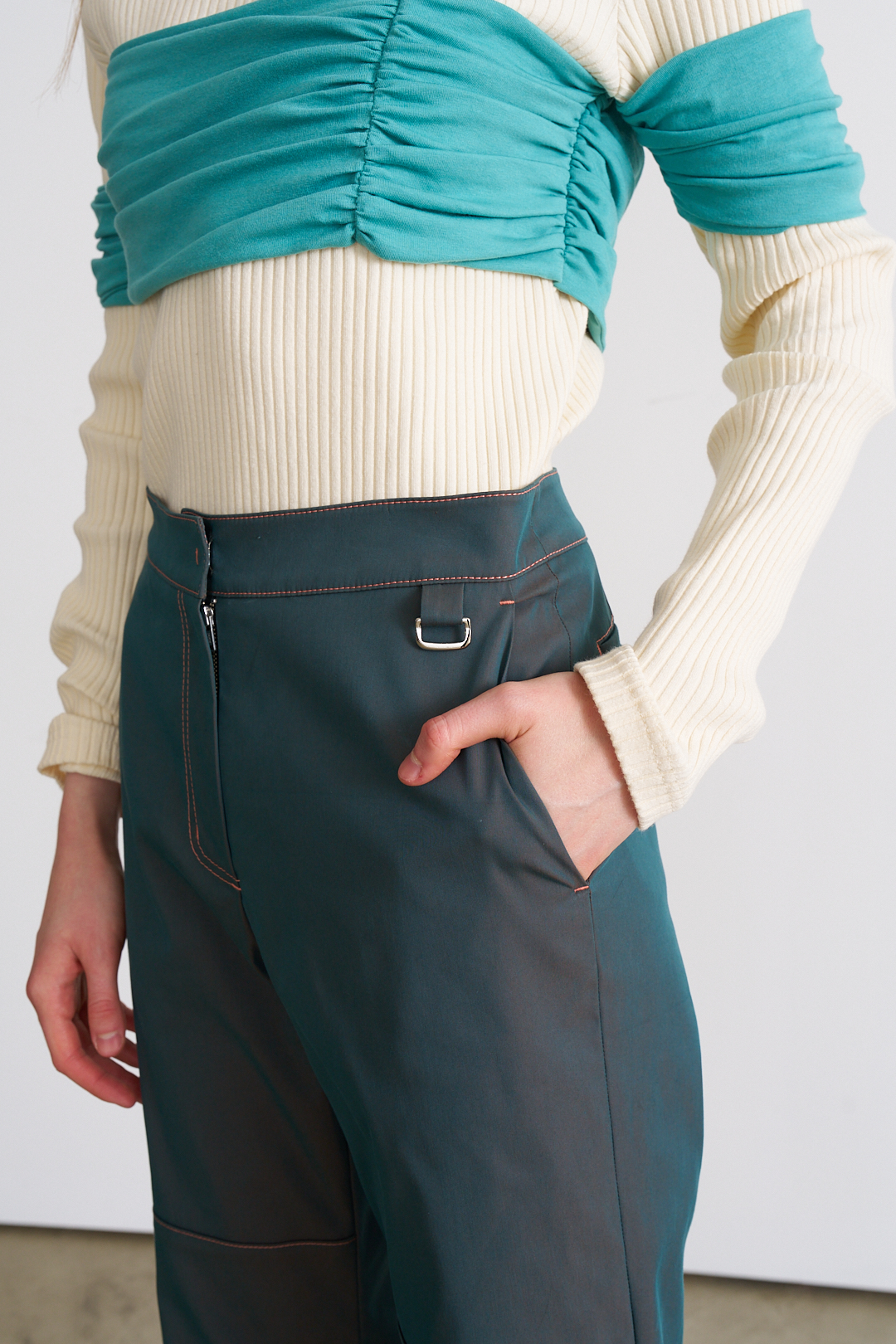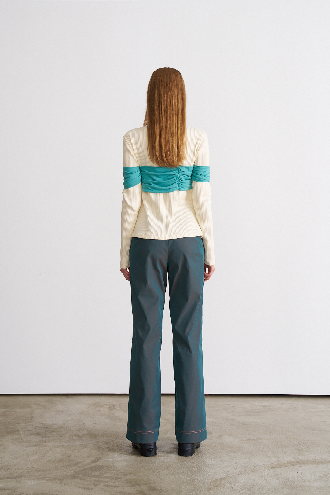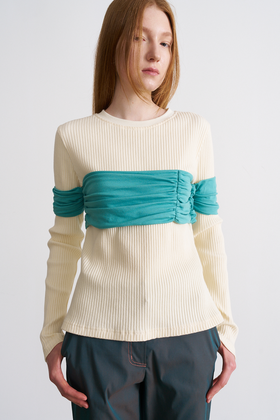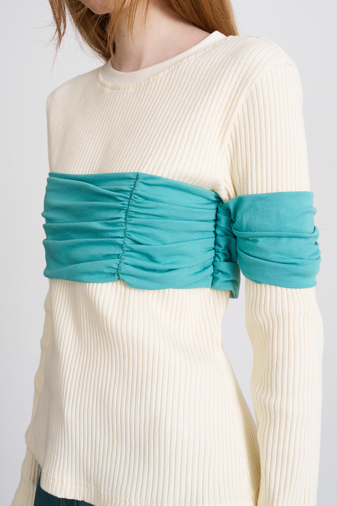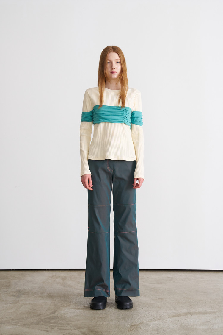 가슴과 팔 부분의 커튼을 연상시키는 드레이핑 덧장이 독특한 롱 슬리브 입니다. 몸판 원단은 볼드한 립 원단으로 제작되었으며, 넥 부분은 텐션이 좋은 원단을 사용하여 착용시 부드럽게 늘어납니다.
